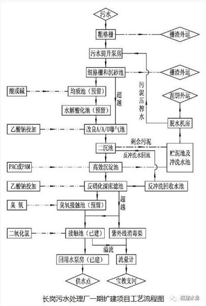 為達到環(huán)保部門要求的水質,長崗污水處理廠尾水進行了提標改造,具體工藝如下:
