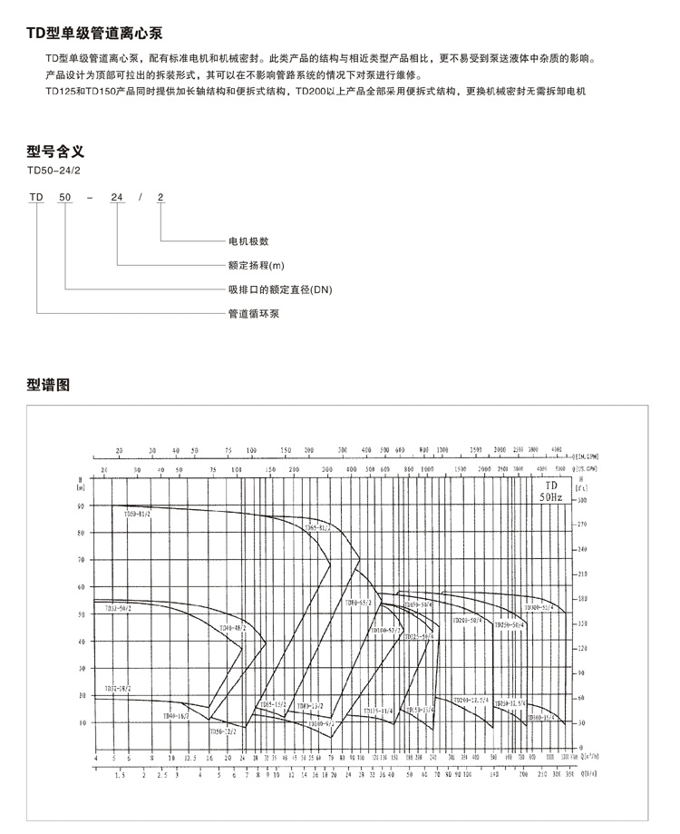 其中TD32-TD150口徑產品為加長軸結構,TD200-TD300口徑產品為便拆式結構,便拆式結構采用集裝式機械密封,更換機械密封時無需拆卸電機。
